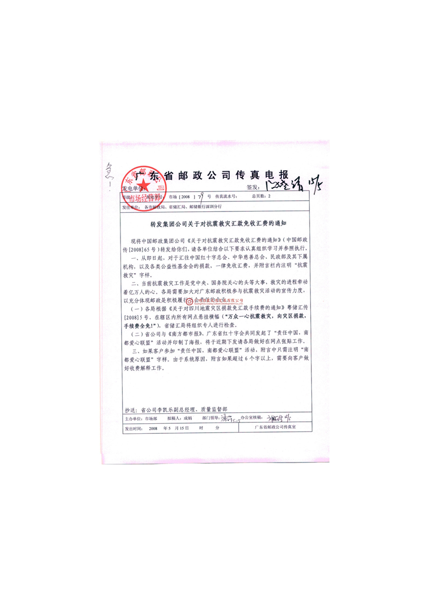 邮寄赈灾捐款免汇费 2008年05月15日18:21 金羊网-羊城晚报 本报讯 记者邝穗雄、通讯员朱应富报道:昨天从广州邮政局得到消息,即日起经邮政通道汇往所有慈善机构的救灾捐款一律免收汇费。 昨日,经市邮政局研究决定,发挥邮政网点众多、覆盖范围广的优势,方便广大市民为赈灾踊跃捐赠,凡汇往慈善机构专用账户的赈款一律免收手续费。
