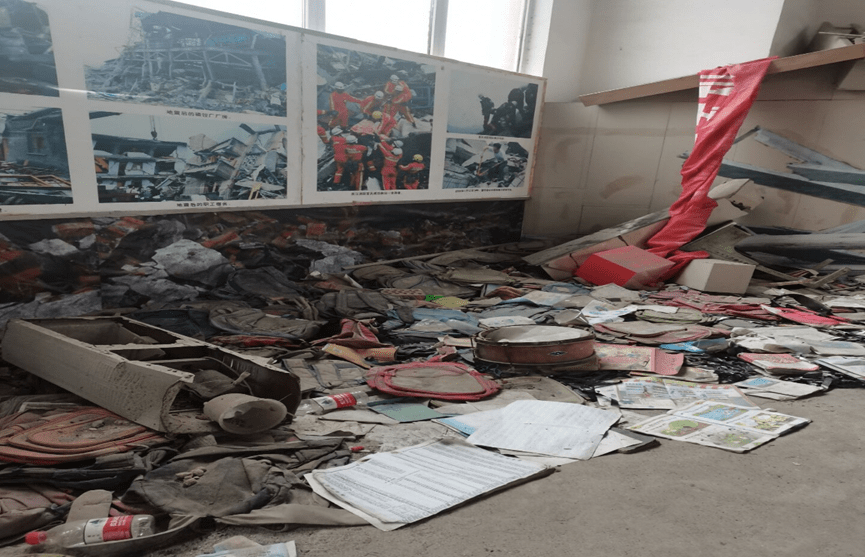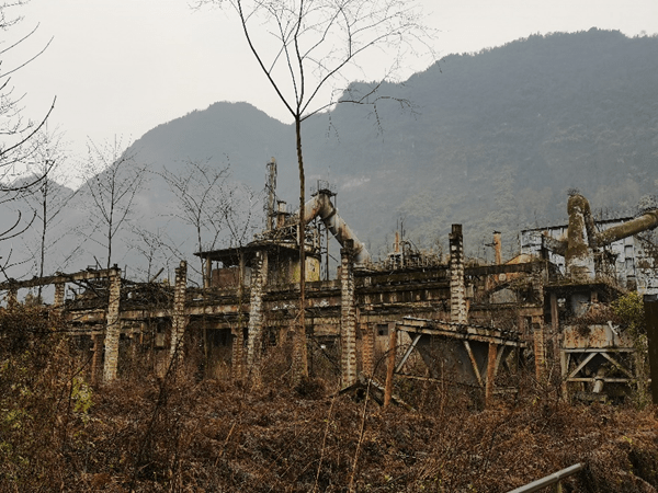 在遗址核心保护区――四川宏达股份有限公司磷化工公司穿心店生产基地的厂区内,高达30多米的磷氨干燥塔倒塌在大门口,成为这里的标志性景观之一;厂区内各种办公楼、车间及各式设施设备被地震损毁得面目全非;生活区内的楼房也全部坍塌,有的6层楼建筑甚至仅剩下3层;阳台上依稀可见人们在地震前晾晒的衣物,废墟中有不少学生用过的书包和墨水瓶,一些角落里还残留着幸存者们祭奠罹难亲属时燃点过的蜡烛和灰烬……这一切似乎都在无声地向作为来访者的我们,讲述着地震的惨烈和带给灾区人民的深重灾难。