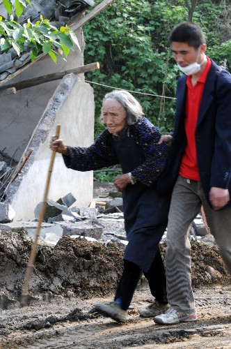 5月15日,一位老人被搀扶着走出与外界隔离3天的红白镇灾区。5月12日的汶川地震使四川省什邡市成为重灾区。据当地有关部门介绍,这个市的洛水、蓥华、红白等镇倒塌房屋32万间,死亡3000多人,受伤30000多人,失踪2591人。灾区群众生活十分困难。 新华社记者 姜帆 摄