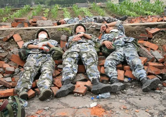 经过38小时长途摩托化行军后陆战队员立即投入救灾战斗,救灾间隙官兵躺在砖块上就能睡着