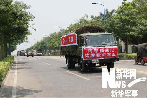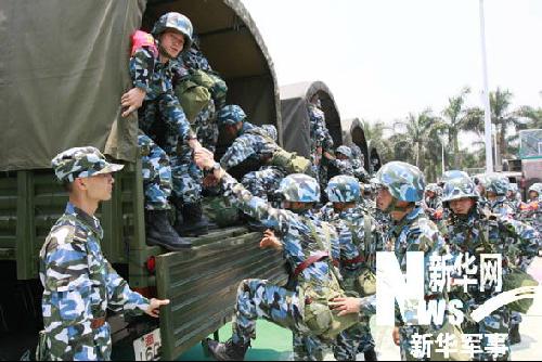 5月14日14时,2750名身着海洋迷彩的海军陆战队员分乘202辆特种车辆,从广东湛江急速向四川疾进。