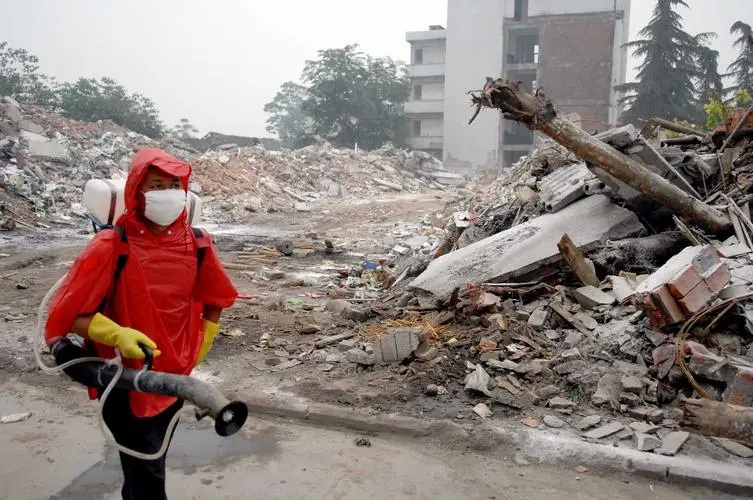 5月15日上午,消防战士在四川省什邡市蓥华镇云峰化工厂倒塌的宿舍楼废墟中搜救。5月12日的汶川地震使四川省什邡市成为重灾区,这个市的洛水、蓥华、红白等镇沦为一片废墟,房屋倒塌在90%以上。14日晚,江苏南京消防地震救援队赶到蓥华,并于15日清晨开始在云峰化工厂倒塌的宿舍楼废墟中搜救幸存者。
