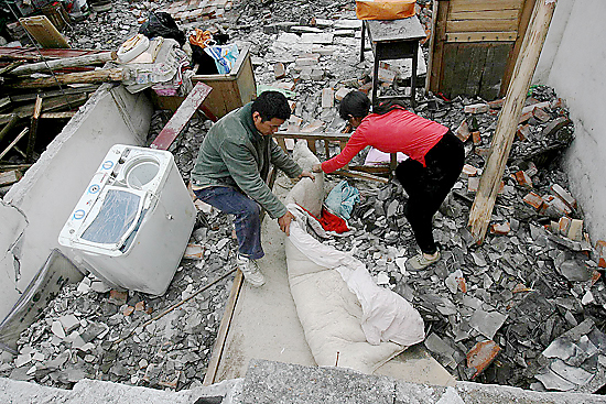 2008年5月14日,四川省什邡市洛水镇,洛水镇的市民在倒塌的房屋内找物品,为重建家园做准备。2008年05月16日15:33 长江商报