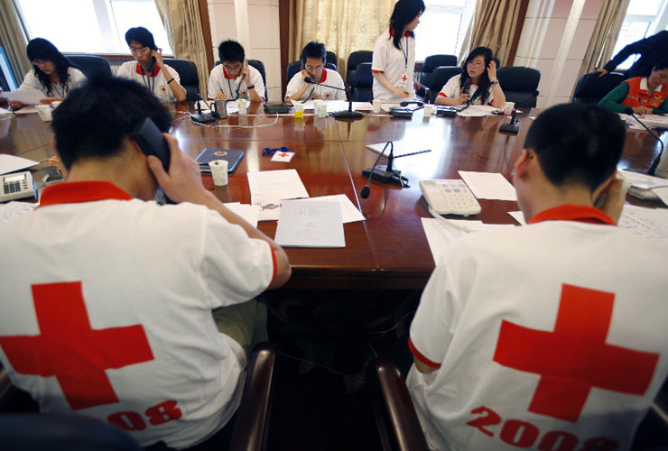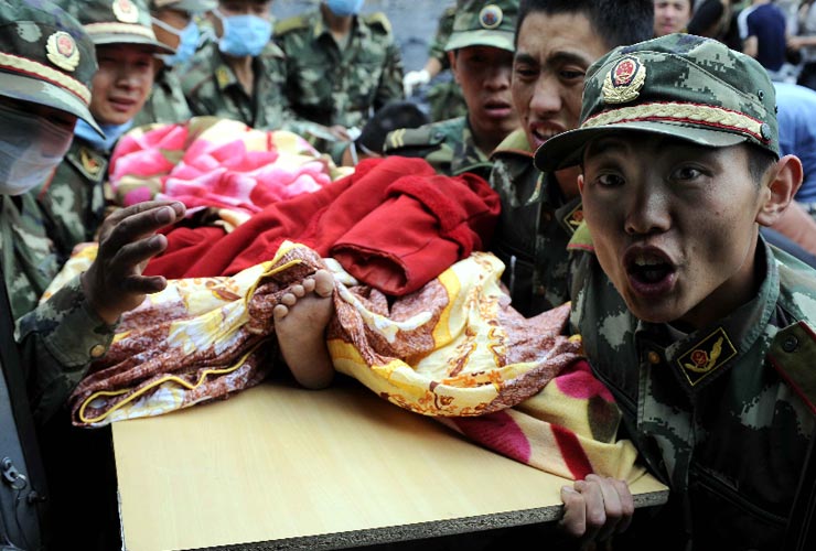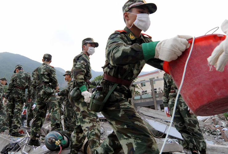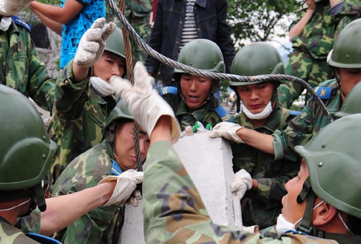 5月14日下午,解放军官兵采用接力方式运送清理出的杂物。当日,救援人员继续在地震后的北川县北川中学搜救幸存者。据现场医务人员统计,截至20时,救援人员当日在垮塌的校舍中营救出80余名师生。