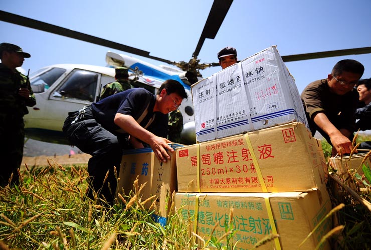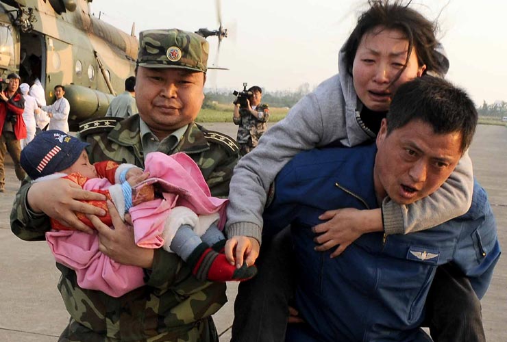 5月14日,在汶川县映秀镇抗震救灾的部队官兵正将当地的重伤员护送登上直升机