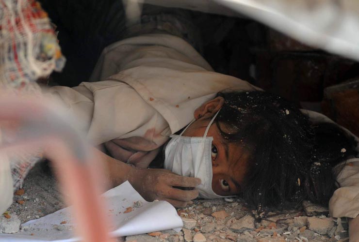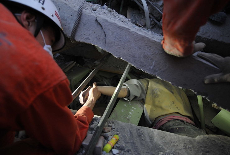 5月14日傍晚,正在地震后的北川中学搜救幸存者的救援人员脱下手套,拉住被压在水泥板下的高中女生,鼓励她继续坚持。