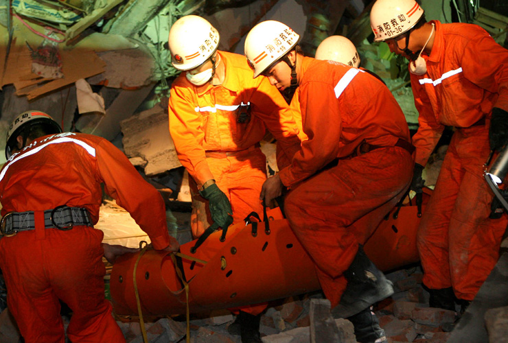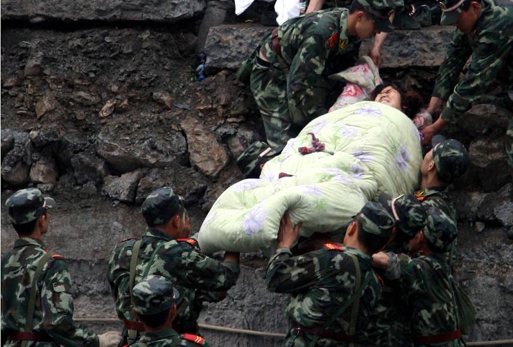 5月16日,救灾人员从四川什邡地震灾区废墟深处救出一名生还者。新华社记者姜帆摄