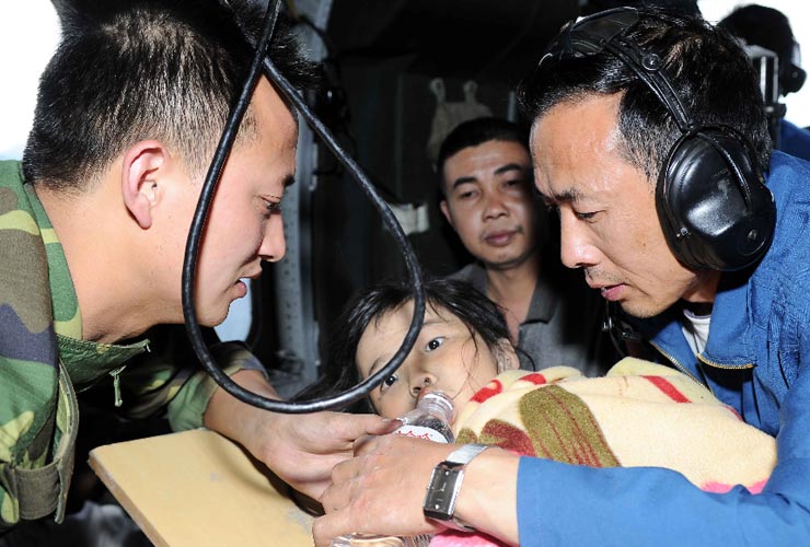 5月14日,成都军区救援人员骆斌(上)正在救灾直升机上照顾汶川县映秀镇受伤的藏族群众王群英。