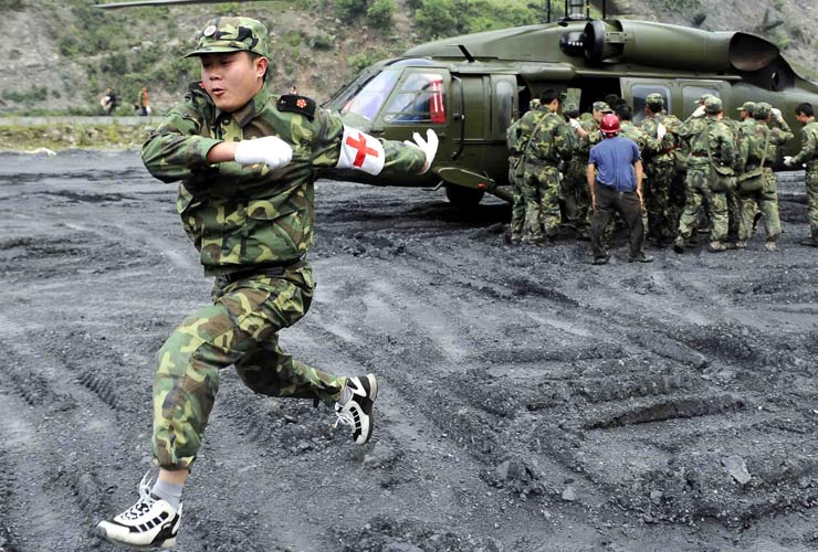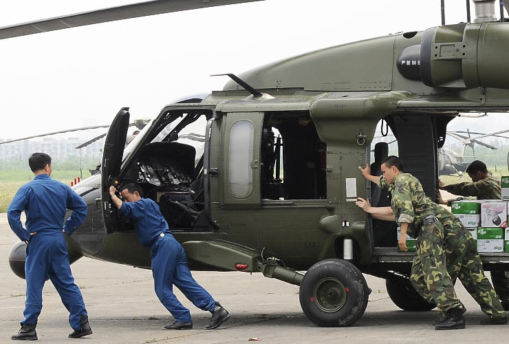 5月14日,成都军区某陆航团官兵正在紧急移动救灾直升机