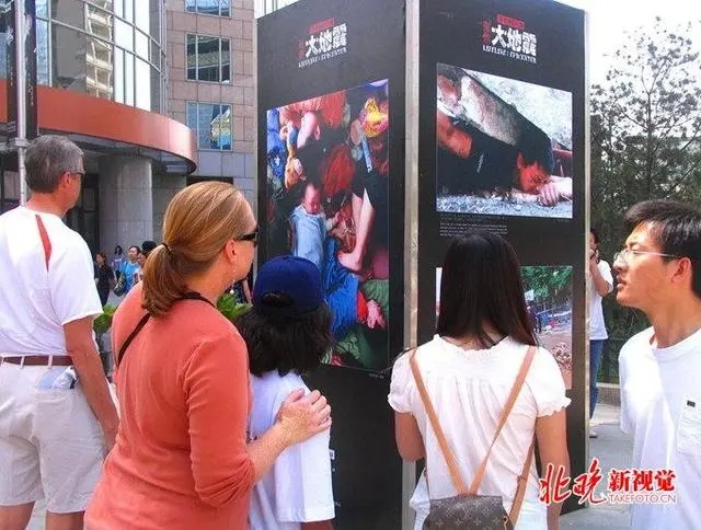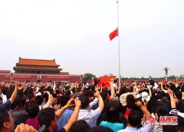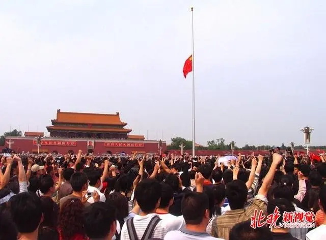 图为,人们从四面八方来到天安门广场高呼,汶川加油!