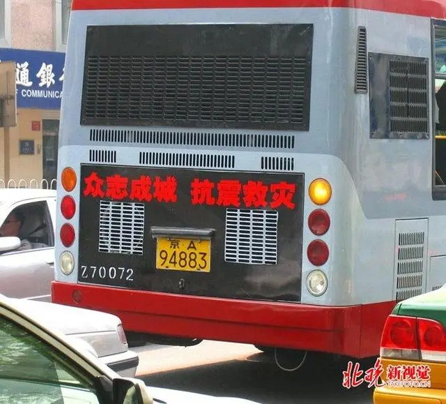 街头公交车、显示屏和文化馆上巨幅标语为灾区人民加油。