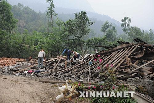 5月17日,北川县陈家坝镇的几位灾民在自家房屋废墟上寻找东西。 新华社记者杨世尧摄