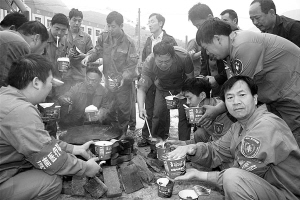12时20分,大家用方便面为去成都的队员送行。近60个小时的相伴,所有人已成为真正的“战友”。