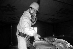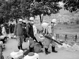 9时5分,周玉东召集灾区群众,讲解卫生防疫知识,并派两名心理专家开展服务。救援队队员开始配药,对每个帐篷进行消毒。150个帐篷,队员们用了两个多小时进行反复消毒。穿着防护服,每人身上都被汗水湿透了。
