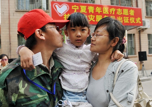 银川,2008年5月20日 宁夏青年医疗志愿者赴地震灾区 5月20日,银川市第一职业中学的老师马力尧(左一)和家人告别。 当日,由14名队员组成的宁夏青年医疗志愿者抗震救灾服务队奔赴地震灾区四川省德阳市,以帮助灾区人民抗震救灾、渡过难关。 新华社记者 王鹏摄