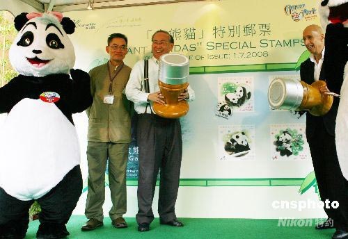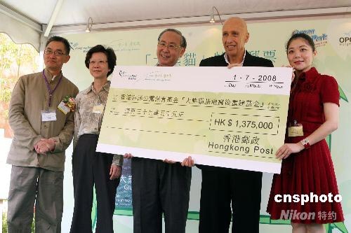 香港邮政将发售限量版大熊猫掌印及邮票珍藏纪念邮品筹得的一百三十多万港币转赠给香港海洋公园保育基金,以支持重建四川大熊猫基地设施。中新社发武仲林摄 |