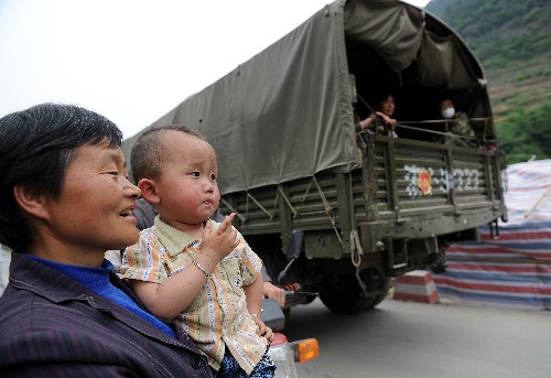 5月20日,在四川省青川县,一名灾区妇女抱着孙子在公路边欢送撤离的解放军官兵。在四川省青川县地震灾区参加抗震救灾的部分解放军官兵在奋战一周后,进行轮换,灾区群众纷纷到路边欢送撤离官兵。新华社记者 蔺以光 摄