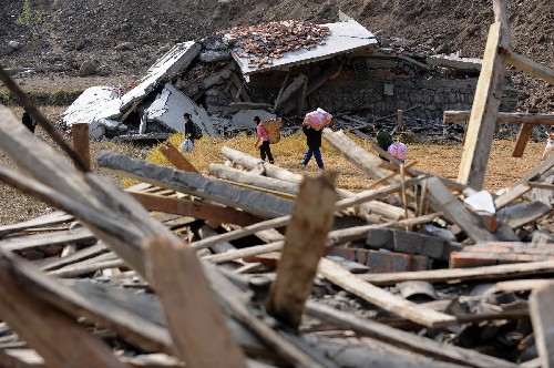 5月15日,青川县红光乡东河村,几位灾民从废墟旁走过。新华社记者 江宏景 摄