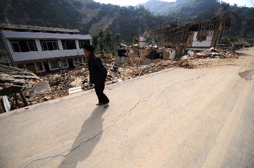 5月15日,青川县红光乡东河村,一位老人从废墟旁的路上走过。记者从四川省青川县抗震救灾指挥部了解到,截至目前,汶川地震已造成青川县1000多人遇难,上万人受伤。由于该县关庄镇3000万方的滑坡使得青川县通往马公乡、石坝乡、观音店乡、曲河乡四个乡镇公路阻断,这四个乡镇灾情至今不明。 新华社记者 江宏景 摄