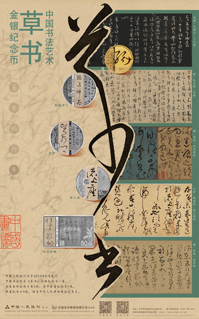 作为中国书法艺术金银纪念币的第五组纪念币,同时也是全系列的收官项目,中国书法艺术(草书)金银纪念币定于2023年6月27日发行。该套纪念币共5枚,其中8克金币1枚、150克银币1枚,30克银币3枚,均为中华人民共和国法定货币。纪念币背面选取了草书发展史上极具代表性的五幅今草和狂草佳作,记录了草书从魏晋到唐代的逐渐成熟、再到宋代进一步升华的主要阶段。至此,中国书法艺术金银纪念币已发行完毕,将对完整展现中国书法文化、持续讲好金币书法故事、满足市场系列集藏需求,发挥重要的促进作用,同时也具有深远的历史意义。