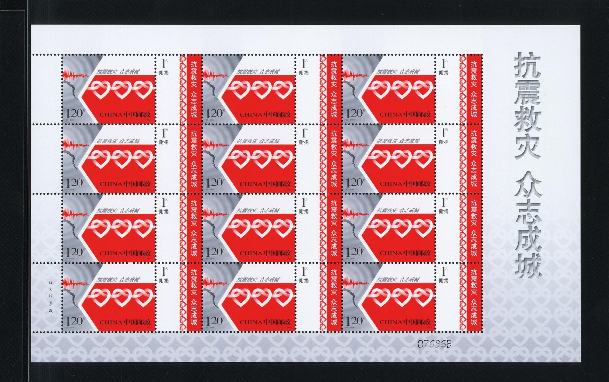 邮票主图是震波和大地裂纹,在指向震区的红色箭头上有三颗连在一起的心,诠释了“抗震救灾众志成城”的主题。副票为9颗连在一起的红心和“抗震救灾众志成城”文字。