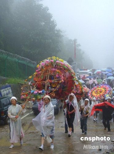 8月19日,是“5·12”汶川特大地震发生一百天的日子,上万民众前往北川灾难现场祭奠遇难亲人。图为遇难者亲属携带花圈,从茂县赶赴北川,前往灾难现场祭奠遇难亲人。 中新社发 霍潺 摄