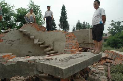 本站5月20日绵阳讯(记者 赵建平)记者来到绵阳市城郊乡金家岭村,一座水塔因为遭受地震,两个小时前被迫炸掉,以防倒塌伤人。工人们还在处理倒塌后的残骸。