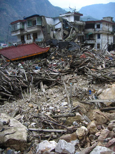 走进城里,原本有些嘈杂的队伍变得安静起来。除了不多的几声感慨,这里只有可以填满数个房间的巨大落石、扭曲倾斜的楼房和变为瓦砾的民居,散落、堆砌在坎坷不平的道路两旁,诉说着曾经的巨变。
