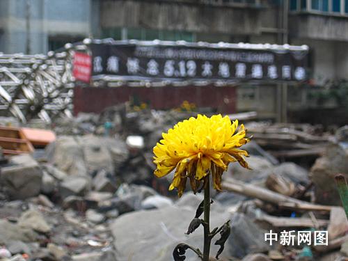 祭奠者献上的鲜花在废墟中分外醒目。 吴翔 摄