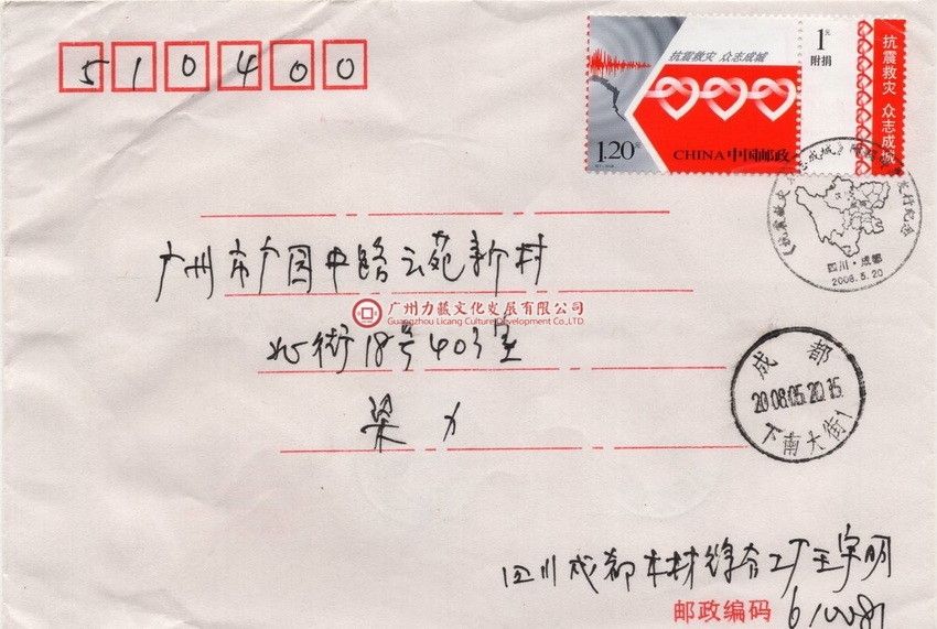 成都(2008.5.20)-广州(5.28)首日实寄封