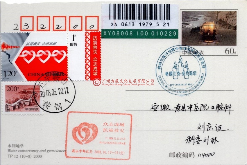 盖“举国之殇 全民同咽,向四川汶川地震中罹难的同胞深切哀悼,国务院公告2008年5月19日-21日为全国哀悼日”纪念戳