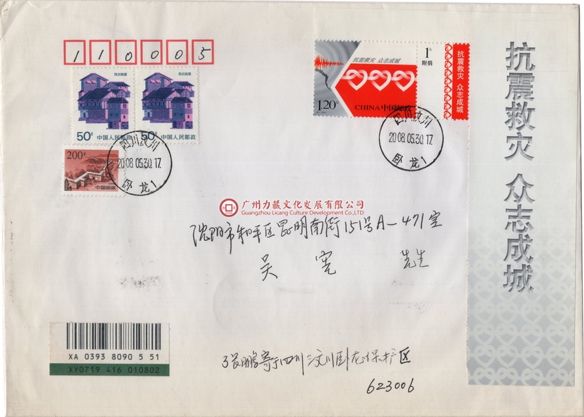 因灾区道路塌方,邮路不畅,从卧龙邮局转运到成都中心局的路途艰难,此件实寄封全程邮路为10天