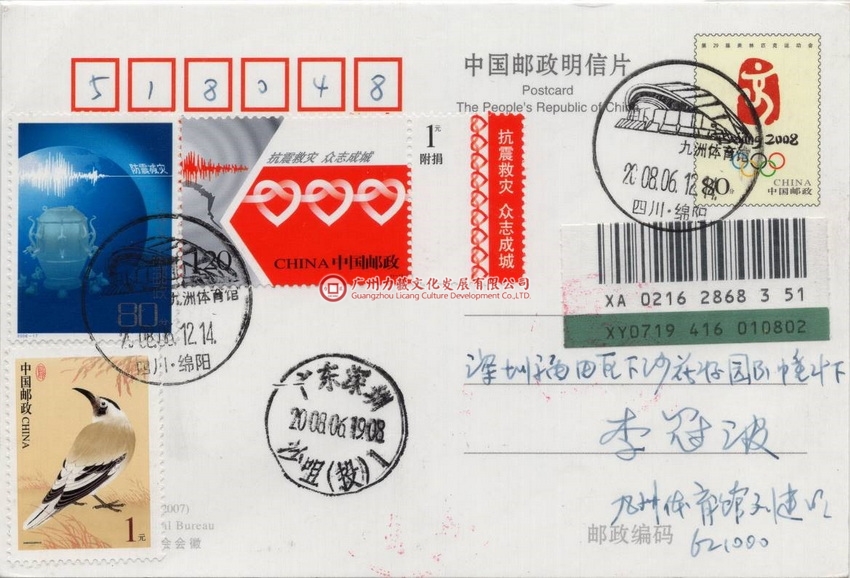 四川绵阳(2008.6.12)-深圳(6.19)挂号明信片