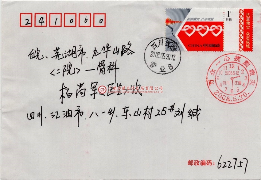 贴特7《抗震救灾 众志成城》邮票,盖江油“万众一心 抗震救灾”纪念戳