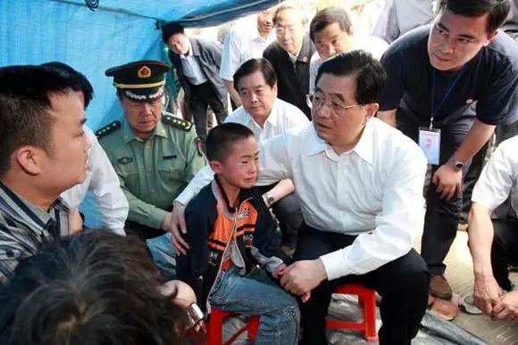 胡锦涛俯下身子,搂过一名在震灾中失去爷爷的男孩说:“要从小学会坚强,不向困难低头,将来一定会有美好的未来!”