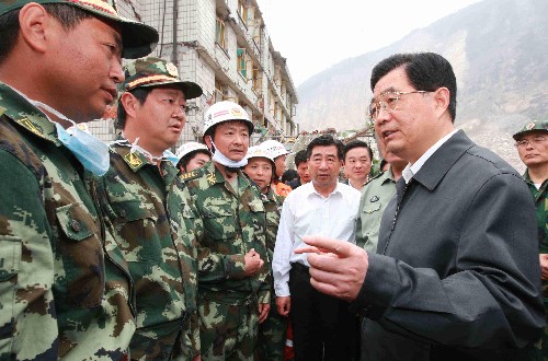 胡锦涛对乡亲们说:中央已经调集了10万解放军和武警部队官兵,正在各个乡、各个村搜救。请乡亲们放心,只要还有一线希望,我们一定会尽最大努力营救。