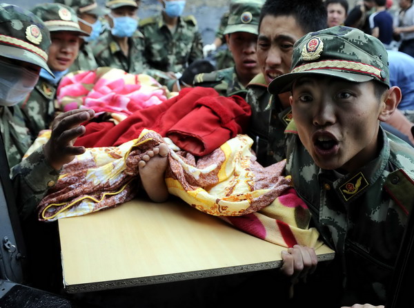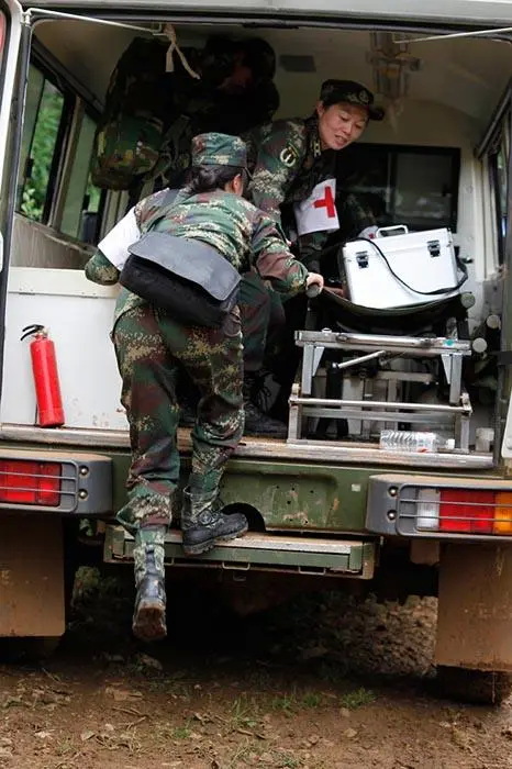 万分焦急的战士们用短铁棍撬起楼板,用千斤顶向上托举,同时用榔头敲碎女孩双脚上的楼板……雨很大,营救人员从头到脚都被淋透了。女孩终于被官兵救出时,已是14日2时。