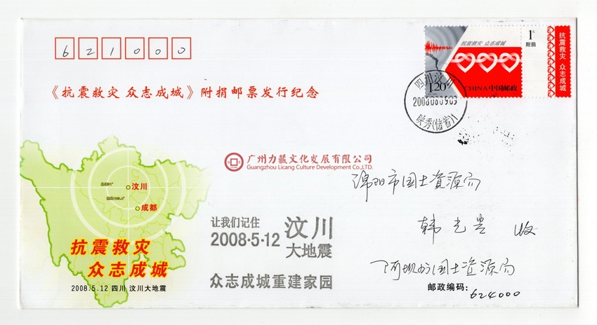 四川汶川映秀邮局,地震震中,2008年6月9日原址仍未能恢复营业,但集邮者从废墟中整理出一枚“储蓄”日戳交给邮局工作人员,当日使用该枚日戳收寄的信件不足10枚,此时距离5月12日地震发生后31天