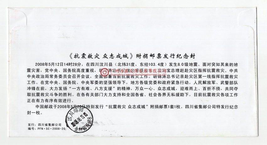 四川汶川映秀储蓄(2008.6.9)-四川绵阳(6.13)实寄封,抗震救灾四川省公司首日封,贴特7《抗震救灾 众志成城》等邮票