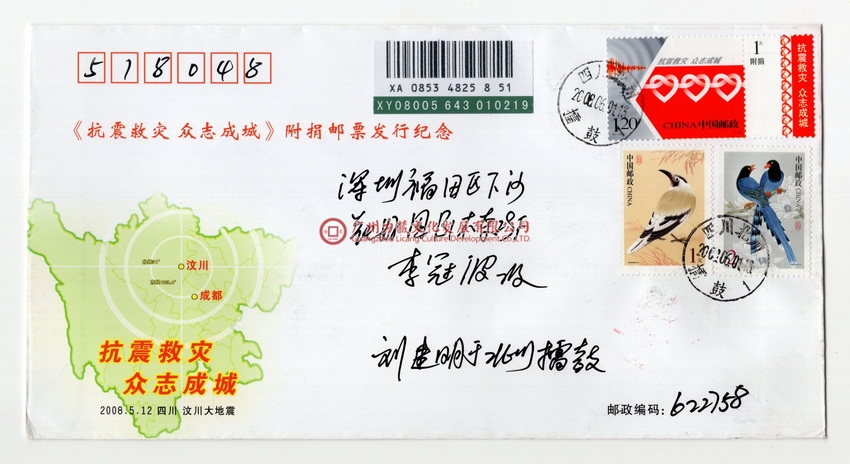 四川北川擂鼓(2008.6.1)-深圳(6.12)实寄封,抗震救灾四川省公司首日封,贴特7《抗震救灾 众志成城》等邮票