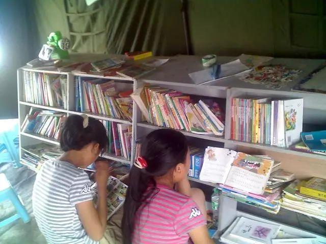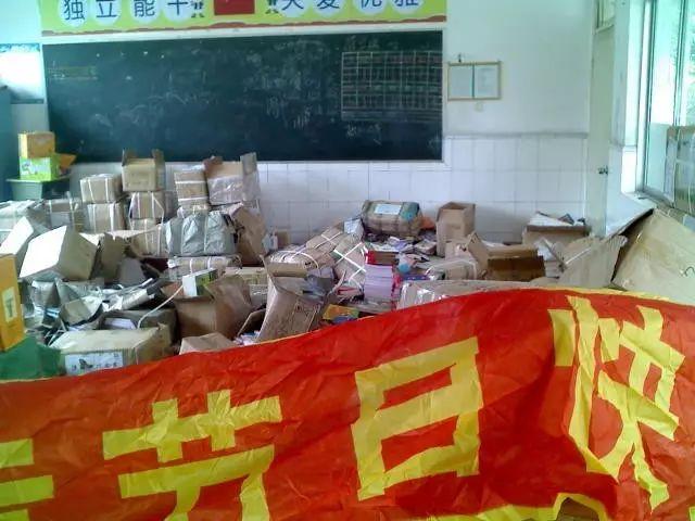 收到的图书准备捐给帐篷小学的孩子们,盖着的布单是绵阳学校里之前的节日标语