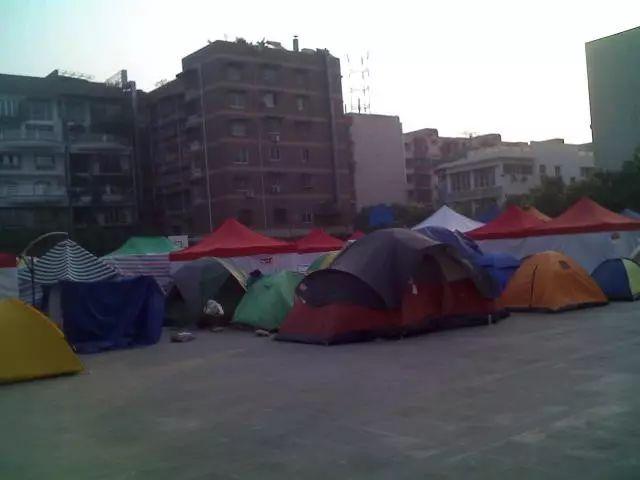 志愿者夜晚露宿在绵阳市火炬小学操场上的帐篷里