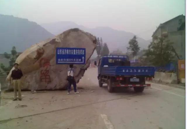 去北川县城废墟的路上,最大的一块落石。拦腰斩断的楼房