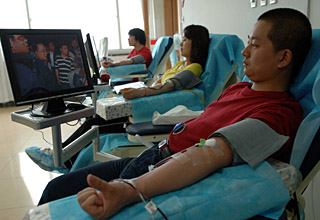 四川汶川地震发生后,唐山市民纷纷到血站和街头流动献血车进行献血,以表达对灾区人民的支持。新华社 发