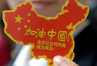 唐山某商场的工作人员展示他们特意制作的“加油中国”的图标。
