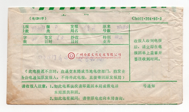 电报于6月2日16:40由收报局成功接收后,由中国电信四川德阳分公司电报专席打印报文,送交德阳市南街邮政支局以挂号信的方式寄给收报人,但因地震发生邮路不通,无法找到收报人,或收报人已失踪遇难(邮送电报时效要求“发往城镇的电报,自交发时间起,12小时左右送达收报人”),报文于6月3日17:00以挂号信方式退回哈尔滨发报人,于6月15日到达哈尔滨,贴票邮资4.2元为外埠平信1.20+国内挂号3.00=4.20