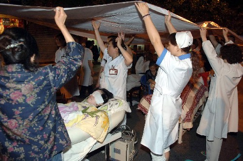 5月12日,汶川发生地震后,成都的医护人员为“街头病房”搭建临时抗震棚。 5月12日,四川汶川地震波及成都,成都市民积极避险自救。目前,成都市区秩序正常。 新华社发(余坪 摄)