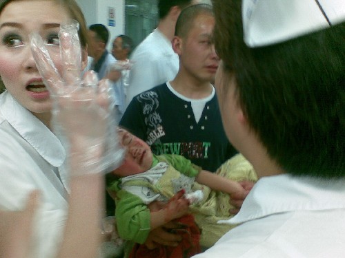 5月12日,在四川省人民医院临时护理集中点,医护人员拉起一张布,为新生婴儿建起临时护理区。 当日,四川汶川地震波及成都,四川省人民医院的医护人员紧急将病人转移到安全地带避险,积极抢救灾区伤员。 新华社发(魏德智 摄)