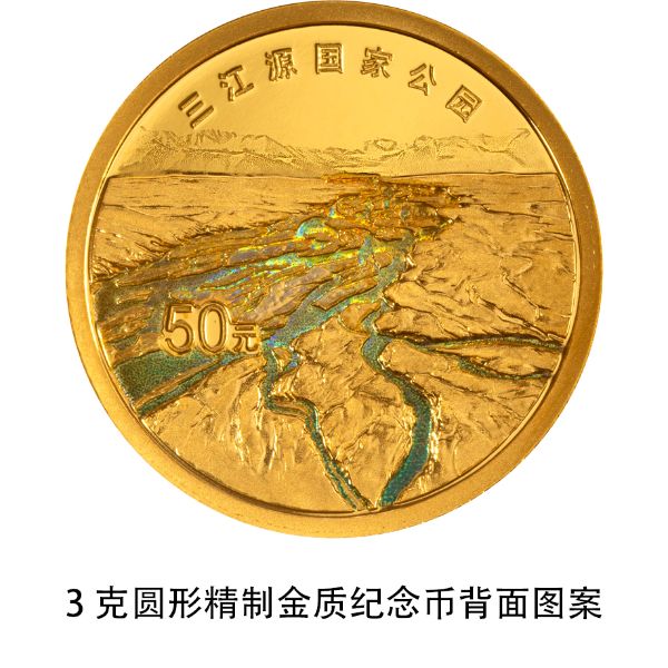 三江源国家公园3克圆形金质纪念币背面图案为三江源国家公园自然景观,并刊“三江源国家公园”字样及面额。