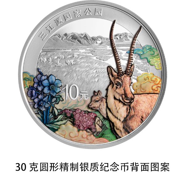 三江源国家公园30克圆形银质纪念币背面图案为藏羚羊、绿绒蒿、点地梅等元素装饰组合设计,衬以三江源国家公园自然景观,并刊“三江源国家公园”字样及面额。